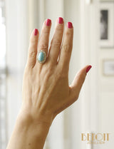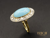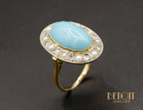 Bague en or jaune 750 millièmes datant de la fin du XIXe ornée en son centre d'un cabochon de turquoise bleue à la couleur uniforme sertie clos or jaune avec millegrain. Elle est entourée d'un réhaut de platine pavé d'une alternance de diamants taille rose et de demi-perles fines. Son panier est travaillé d'une dentelle ajourée. Corps de bague simple.