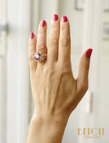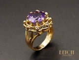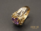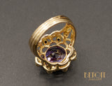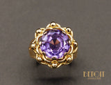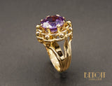 Bague en or rose 750 millièmes ornée en son centre d'une améthyste ronde d'un beau violet intense serti sur huit griffes, placé au centre d'un motif floral entièrement réalisé en fil d'or rose où une bille d'or orne chaque pétale. Corps de bague large formé de fils et de deux longs motifs de feuilles. Très beau travail typique des années 1950.