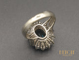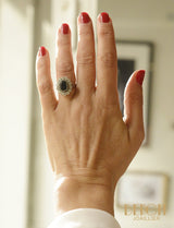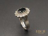 Bague en or blanc 585 millièmes ornée en son centre d'un saphir ovale bleu vert serti par quatorze griffes et entouré de quatorze diamants taille brillant sertis également sur griffes. Le panier est entièrement réalisé en fils et monté sur un corps de bague en fils.