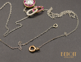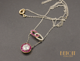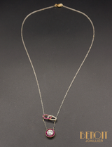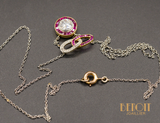 Chaîne d'époque en platine, sur laquelle sont montés deux pendentif en or jaune 750 millièmes et platine. Le premier pendentif formé de deux anneaux entrelacés, l'un serti de diamants taille rose sur griffes et millegrain en platine et l'autre de rubis calibrés sertis en clos, l'ensemble coulisse sur la chaîne. Le deuxième pendentif de forme ronde est orné au centre d'un diamant taille ancienne en clos sur platine cerclé d'une bande de calibrés de rubis. Fermoir anneau ressort en or jaune 750 millièmes.