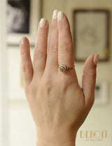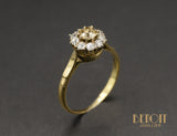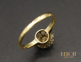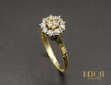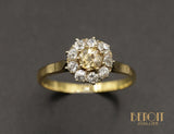 Bague Marguerite en or jaune 750/e, sertie d'un Diamant champagne, taille ancienne, sur 9 griffes, entouré de 9 Diamants taille ancienne et moderne sur griffes. Panier ajouré en couronne dont part le corps de bague simple en fuite.