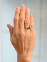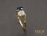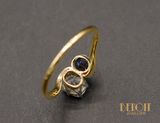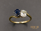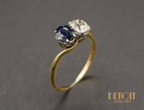 Bague de type "Toi et Moi" en or jaune 750/1000e ornée d'un saphir bleu ovale facetté d'environ 0,30 carat et d'un diamant taille ancienne coussin d'environ 0,70 carat serti chacun sur six griffes de platine. L'anneau forme deux volutes.