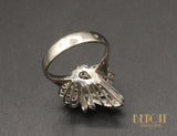 Bague cocktail en or blanc 750 millièmes sertie en son centre d'une émeraude taille émeraude, d'un vert translucide, en clos. Autour, des formes géométriques différentes (représentant un bouquet de fleurs), sont serties de diamants taille brillant. Le panier tout en fil donne un très beau volume à l'ensemble. Bijou de belle facture probablement américaine.