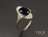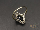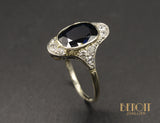 Bague Art Déco ancienne en or blanc 750 millièmes, ornée en son centre d'un saphir ovale bleu nuit d'environ 2,40 carat serti en clos, joliment réhaussé par un entourage tout en courbes, pavé de diamants taille ancienne sur platine. De part et d'autre, le corps de bague en fuite est ajouré et serti de diamants. Le panier de la bague est ajouré et ouvragé de motifs géométriques.