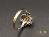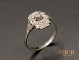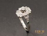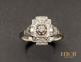 Bague Art Déco en platine dont la tête de bague, de forme Rectangulaire, est serti sur chaton griffes d'un diamant central. Autour, des formes géométriques serties de diamants taille rose, typique des styles Art Déco. Corps de bague simple.