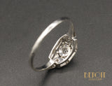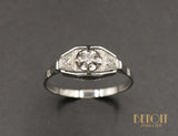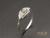 Bague ancienne Art Déco avec tête de bague en platine ornée d'un diamant central, taille brillant, de 0,08 carat, serti sur chaton gaufré, accompagné de motifs géométriques ajourés sertis de diamants taille rose, pour un poids total d'environ 0,03 carat, montée sur un anneau en or blanc 750/1000e.