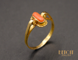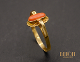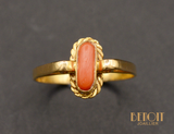 Bague en or rose 750 millièmes, ornée d’un corail  serti en clos dans une  forme très allongée reposant sur une table décorée, maintenue par des palmettes en volutes donnant à l’ensemble une forme très originale.