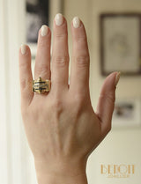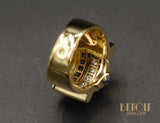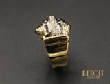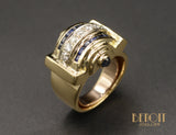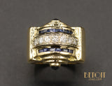 Bague Tank Art Déco en or jaune 750 millièmes, dont le plateau est composé de plusieurs  tiers de disque, dont le centre est serti d'une ligne de 7 Diamants en clos et griffes en or blanc, et de deux lignes de Saphirs calibrés en rail. De chaque coté, un petit cercle de Saphir en cabochon fini le motif. Corps de bague large. Un ressort en or rose est placé dans l'anneau, il peut être retiré sur demande.