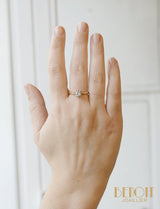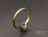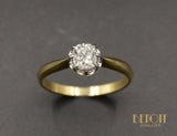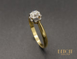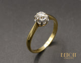 Solitaire en or jaune 750/e orné en son centre d'un Diamant coussin taille ancienne d'environ 0,5 carat, serti dans un chaton d'or blanc 750/e huit griffes, posé sur un corps de bague demi-jonc, pincé arrivé à la tête de bague en or jaune 750/e.