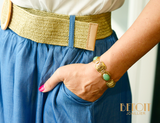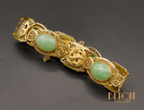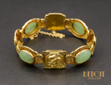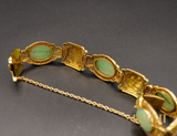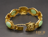 Bracelet articulé en or jaune 585/e, dont les mailles, tantôt carrées et ornées d'un dragon ou ajouré d'un caractère asiatique; tantôt ovale ajouré, sertie d'une Jade. Fermoir à cliquet avec chaine de sécurité fixe.