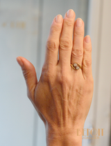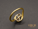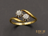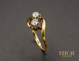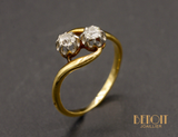 Bague "Toi et Moi" ancienne, en or jaune 750 millièmes, ornée de deux diamants taille ancienne sertis sur 8 griffes de platine. Forme d'inspiration "tourbillon".
