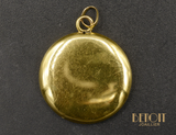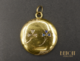 Pendentif en or jaune 750 millièmes de forme ronde appliqué sur une face de 2 motifs à décor floral ponctué de demi perles fines et de demi saphirs. Chaîne non fournie.