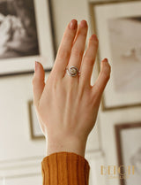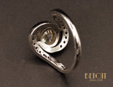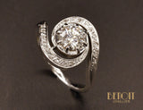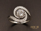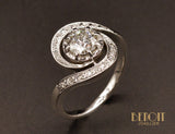 Bague Tourbillon en or blanc 750 millièmes sertie en son centre d'un diamant certifié HRD taille brillant de 1,02ct (J-VVS1) sur chaton gaufré. De part et d'autre, deux volutes s'enroulent autour du diamant, pavées de diamants. Bijou de facture récente s'inspirant des bagues tourbillons des années 1900.