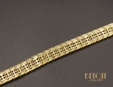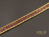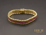Bracelet MAUBOUSSIN en or jaune 750 millièmes entièrement articulé composé de deux lignes centrales de rubis ronds sertis sur griffes, bordé de part et d’autre par des mailles chevrons, donnant l'impression de s'enrouler comme un ruban autour du poinget. Fermoir invisible à cliquet avec un huit de sécurité, signé «Mauboussin Paris». Bijou en très bon état.
