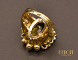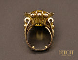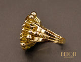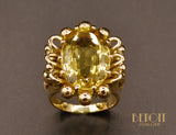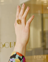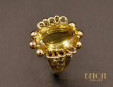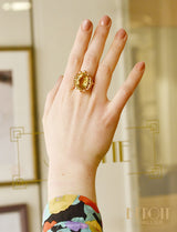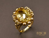 Bague cocktail en or rose 750 millièmes dans le pure style des années 1950 sertie en son centre d'une citrine ovale dans un jeu de volumes composé de fils ronds et de billes de diverses tailles comme des pétales. De chaque coté, les palmettes travaillées elles aussi viennent se courber sur le panier de fils. Le corps en fuite s'affine en bas de l'anneau. Très beau travail des volumes.