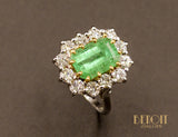 Bague en or blanc 750 millièmes mettant en valeur une belle émeraude taille émeraude d'un vert tendre, sertie sur chaton dix griffes en or jaune 750 millièmes. Elle est entourée de diamants taille brillant sertis sur griffes formant le panier de la bague. Corps de bague épuré en demi-jonc.