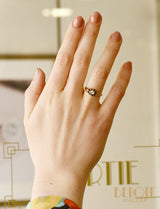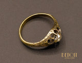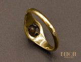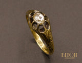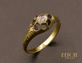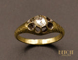 Bague solitaire en or jaune 750 millièmes sertie d'un diamant poire taille rose sur chaton en argent patiné, au centre de longues griffes en pétales, patinés également. Corps de bague en jonc évasé, finement orné de ciselures dans un style floral. Très beau bijou, rare.