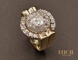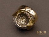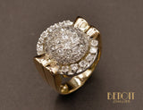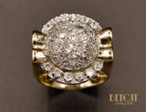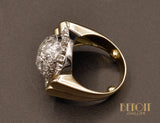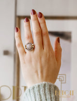 Bague en or rose 750 millièmes dont la tête est composée d'un dôme en platine entièrement pavé de diamants taille ancienne, entouré de diamants sertis sur griffes. De chaque côté de plateau deux godrons terminent et assemblent le corps de bague au plateau. Anneau plat et accompagné de deux billes en bas évitant à la tête de tourner.