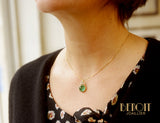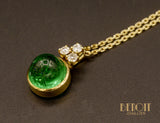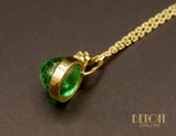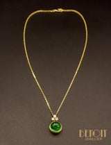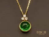 Pendentif en or jaune 750 millièmes orné d'une émeraude cabochon d'un joli vert intense sertie en clos. Au dessus, trois diamants sont sertis sur griffes devant la bélière en fil. Montage sur une chaine neuve en or jaune 750 millièmes.