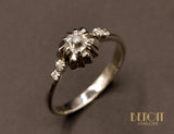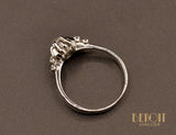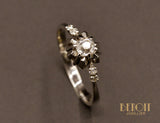 Solitaire Art Déco en or blanc 750 millièmes orné en son centre d'un diamant taille ancienne taille coussin serti en soleil, épaulé de part et d'autre de deux diamants sertis sur chatons quatre griffes. Corps de bague fin en demi-jonc, en fuite vers la tête de bague.