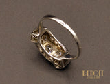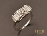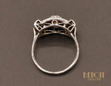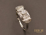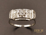 Bague Art Déco en platine serti d'un diamant taille ancienne sur chaton gaufré au centre d'un plateau rectangle cambré, accompagné de deux diamants taille ancienne de chaque coté. Deux trapèzes sertis chacun de deux diamants taille ancienne lient le plateau au corps de bague. Les flancs sont travaillés de découpes géométriques. Corps de bague simple, plat. Très belle facture des années 1930.