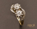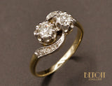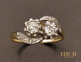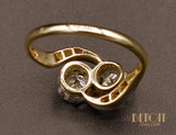 Bague toi et moi en or jaune 750 millièmes dont deux diamants taille ancienne sertis sur chatons gaufrés en platine ornent la tête de bague. De part et d'autre de volutes pavées de diamants taille rose sur réhauts de platine se rejoignent à la manière d'un tourbillon. Belles finitions de mises à jour.