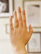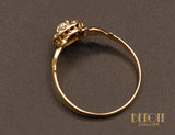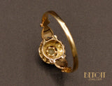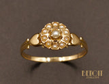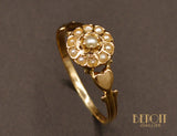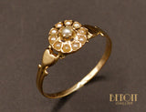 Bague en or rose 750 millièmes dont la tête de bague est sertie d'une demie perle fine sur six griffes, entourée de demies perles. Elle est soutenue de part et d'autre par deux coeurs puis par un corps de bague en trois parties. Bijou délicat.