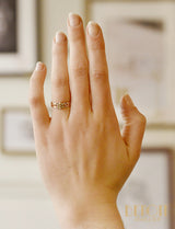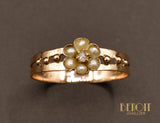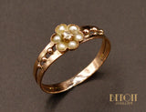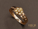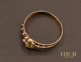 Bague de jeune fille en or rose 750 millièmes sertie d'un diamant taille rose au centre sur six griffes et d'un entourage de six demies perles fines. Le corps de bague est composé de deux rubans plats assemblés par trois billes de chaque coté