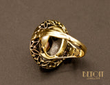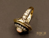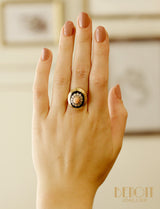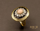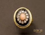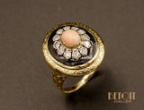 Bague en or jaune 750 millièmes dont le plateau émaillé de noir est orné d'un cabochon de corail rose serti en clos et entouré de diamants formant des pétales en argent. Le plateau est cerclé d'or jaune ciselé. Le panier est finement ouvragé de motifs feuilles. De chaque côté, une branche de feuilles de vigne lie le plateau au corps de bague.