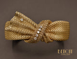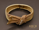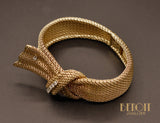 Bracelet en or jaune 750 millièmes en maille souple semblant être noué et drapé autour de poignet. Le motif central est orné de six diamants taille brillant sertis sur chatons de platine et est assemblé à l'arrière par un système de charnière. Système de fermoir cliquet avec huit de sécurité. Joli travail typique des années 1950.