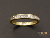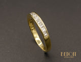 Demi-alliance en or jaune 750 millièmes sertie de onze diamants taille princesse sur sa moitié supérieur en rail. Bijou en excellent état.