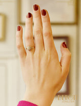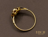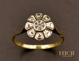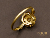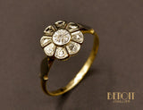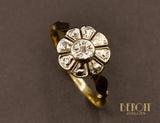 Bague en or jaune 750 millièmes ornée d'un plateau en or blanc 750 millièmes composé de huit pétales ciselées et d'un coeur de fleur serti d'un diamant taille rose. De chaque côté de jolies palmettes en navette lient le plateau au corps de bague en demi jonc.