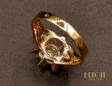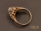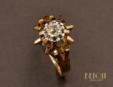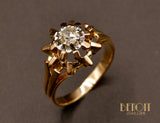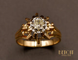 Bague en or rose 750 millièmes sertie en son centre d'un diamant taille coussin taille ancienne sur chaton gaufré de platine, reposant sur deux niveaux croissants de flocons. Le corps de bague en sobre et plat remontant en en double fourche.