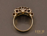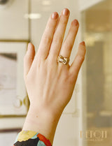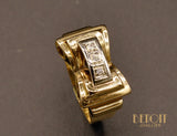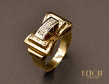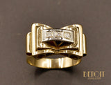 Bague en or rose 750 millièmes dont une bande de platine serti de trois diamants demi taille semble tenir les pages d'un livre ouvert. Ce volume est supporté de chaque coté par deux cylindres puis par un corps de bague large et plat.