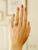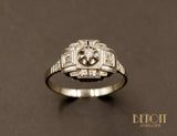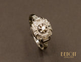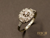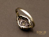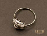 Bague ancienne en or blanc 750 millièmes dont le plateau en platine est composé de diverses formes géométriques serties de diamants taille rose et ancienne. Détails de millegrain.