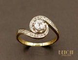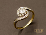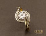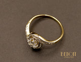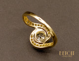 Bague tourbillon en or jaune 750 millièmes ornée en son centre d'un diamant taille ancienne sur chaton couronné huit griffes en platine. De chaque côté, le corps de bague revient en tourbillon autour du chaton central, pavé de diamants taille rose sur réhaut de platine. Bague de belle facture.