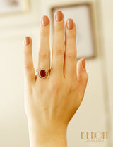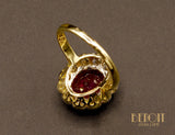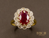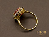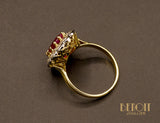 Bague en or jaune 750 millièmes sertie en centre d'un joli rubis ovale framboise sur chaton douze griffes. Il est entouré de doue diamants taille brillant sertis en clos d'or blanc 750 millièmes. Panier repercé à la main de petites arabesques. Corps de bague sobre en demi jonc.