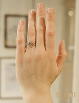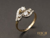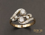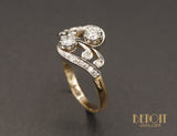 Bague toi et moi Belle Epoque en ors rose et blanc 750 millièmes, ornée en son centre de deux diamants taille moderne sertis sur griffes, soutenus par d’élégantes volutes pavées de diamants. Joli travail de mise à jour.
