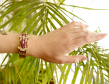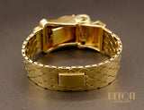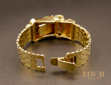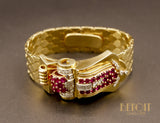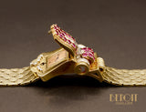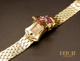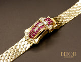 Magnifique montre ancienne en or jaune 585 millièmes dont le boitier de montre est ouvragé de volumes courbes sertis de rubis rond sur griffes et de diamants sertis sur platine. Le cadran est camouflé à l'intérieur du motif principal, s'ouvrant grâce aux deux diamants coulissant à l'extrémité. Bracelet composé de motifs losanges fermés par un fermoir à rabat. Mouvement à remontoir.