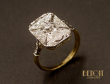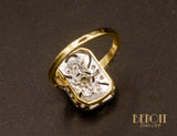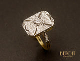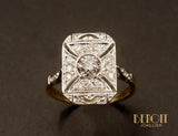 Bague Art Déco en or jaune 750 millièmes dont le plateau rectangle est réhaussé d'or blanc 750 millièmes est serti d'un diamant taille brillant sur chaton gaufré et pavé de diamants dans un jeu de pleins et de jours géométriques. Fines palmettes en pointes pavées de diamants rejoignant un corps de bague semblant fait de deux fils.