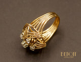 Bague dôme en or jaune 750 millièmes dont la tête de bague est formée par un jeu de triple fils en rosace démarrant du diamant taille brillant central serti sur chaton huit griffes de platine. Entourage de six diamants taille brillant sertis sur chaton quatre griffes de platine. Corps de bague large, en fuite, fait de six fils. Joli travail typique des années 1950.