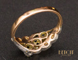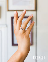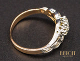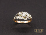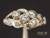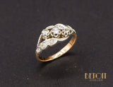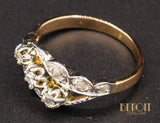 Bague en or rose 750/1000e réhaussée de platine ornée en son centre d'un diamant demi taille d'environ 0,06 carat serti sur un chaton six griffes accompagné en diagonale de deux autres diamants taille rose également sur chaton gaufré six griffes. Cette trilogie est au centre de motifs de vagues serties de diamants taille rose, s'enroulant autour. Corps de bague plat.