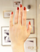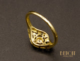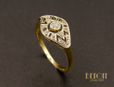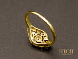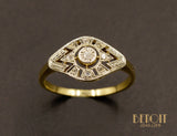 Bague ancienne en or jaune 750 millièmes orné d'un plateau losange réhaussé d'or blanc 750 millièmes repercé géométriquement et serti de diamants taille rose. Joli détails de millegrains.