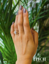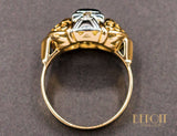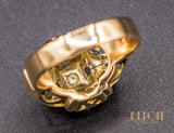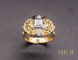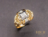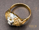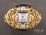 Bague typique des années 1950 en or jaune 750/1000e (18K), ornée en son centre d'un diamant d'environ 0,05 carat serti dans dans un carré de platine posé sur un dôme allongé et travaillé d'arabesques et de formes géométriques en or rose 750/1000e et platine. Corps de bague plat. Poinçon aigle.
