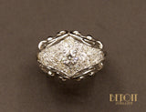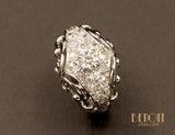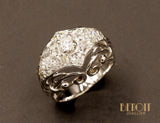 Bague style boule en or blanc 750 millièmes dont le plateau du haut est serti d'un diamant taille brillant en son centre et pavé de diamants taille ancienne. Tout autour un décor en fils, torsades et billes ornemente le corps de bague. Bijou de belle facture.