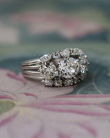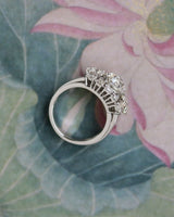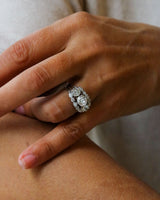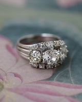 Bague en or blanc 750/e, ornée en son centre de 3 diamants taille ancienne sertis chacun sur 6 griffes, encadrés par deux bandes de diamants ronds et navette alternés, sertis également sur griffes. Corps de bague composé de 4 fils d'or  blanc.