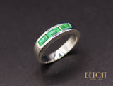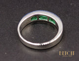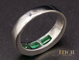 Bague en or blanc 750/1000e de forme minimaliste, jonc plat orné de trois émeraudes taille baguette serties en rail. Bijou mixte.
