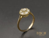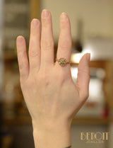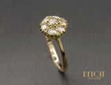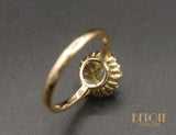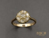 Bague style "Marguerite" en or rose 750 millièmes, avec en son centre un Diamant taille rose, entouré de diamants taille rose pour un poids total d'environ 0,15 carat. Corps de bague demi jonc en fuite arrivant pincées sur les palmettes.