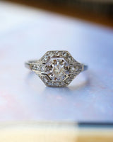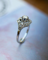 Bague ancienne Art Déco avec tête de bague en platine ornée d'un diamant taille ancienne d'environ 0,12 carat, serti sur chaton gaufré, accompagné de motifs géométriques ajourés sertis de diamants taille rose pour un poids total d'environ 0,06 carat, montée sur un anneau en or blanc 750/e.