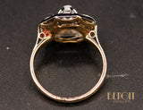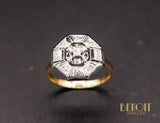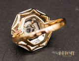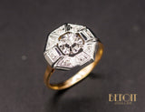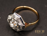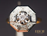 Bague Art Déco en or rose 750/1000e surmontée d'un plateau carré pans coupés en or blanc 750/1000e, serti en son centre d'un diamant taille rose d'environ 0,02 carat serti sur chaton gaufré 6 griffes, positionné au centre d'un centre d'un entourage finement décoré de gravures et de millegrain, agrémenté au centre de chaque pan d'un petit diamant taille rose. Corps de bague plat, panier découpé en écailles. Poinçon aigle.
